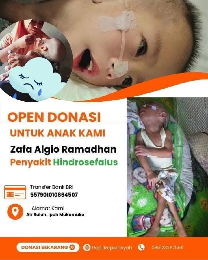 Mukomuko – Zafa Algio Ramadhan, seorang Anak asal Desa Air Buluh, Kecamatan Ipuh, Kabupaten Mukomuko, tengah berjuang melawan penyakit hidrosefalus yang dideritanya sejak kecil. Kondisi tubuhnya yang lemah dengan kepala membesar membuat Zafa harus mendapatkan perawatan intensif.
