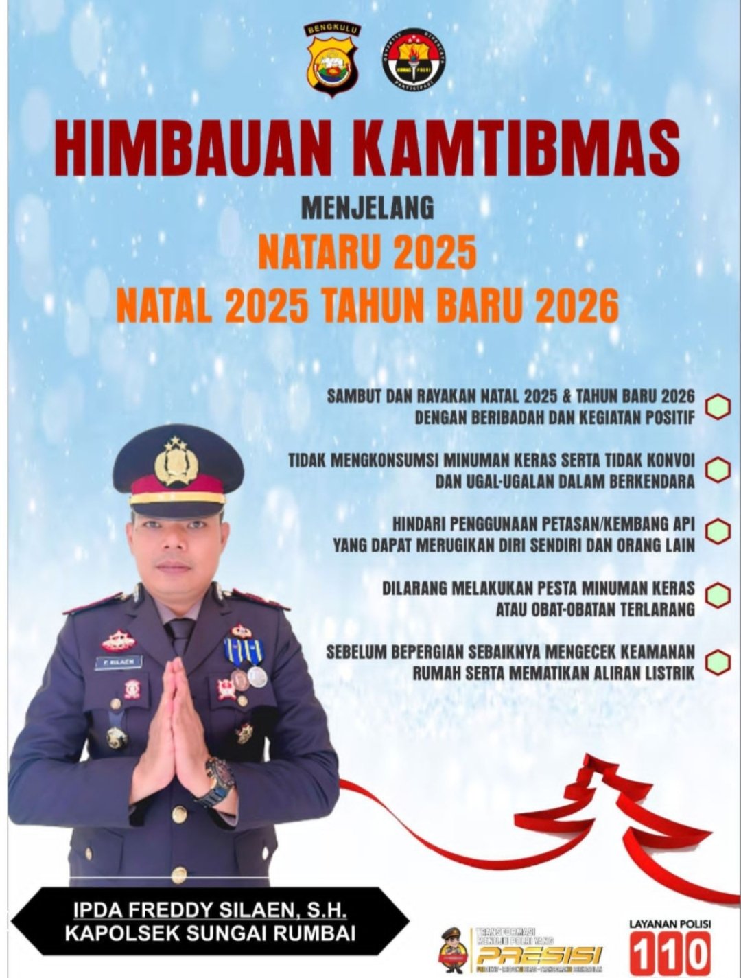Mukomuko – Menjelang perayaan Natal 2025 dan Tahun Baru 2026 (Nataru), Kapolsek Sungai Rumbai, Ipda Freddy Silaen, S.H., mengeluarkan imbauan kamtibmas kepada seluruh masyarakat agar bersama-sama menjaga keamanan dan ketertiban di wilayah hukum Polsek Sungai Rumbai.