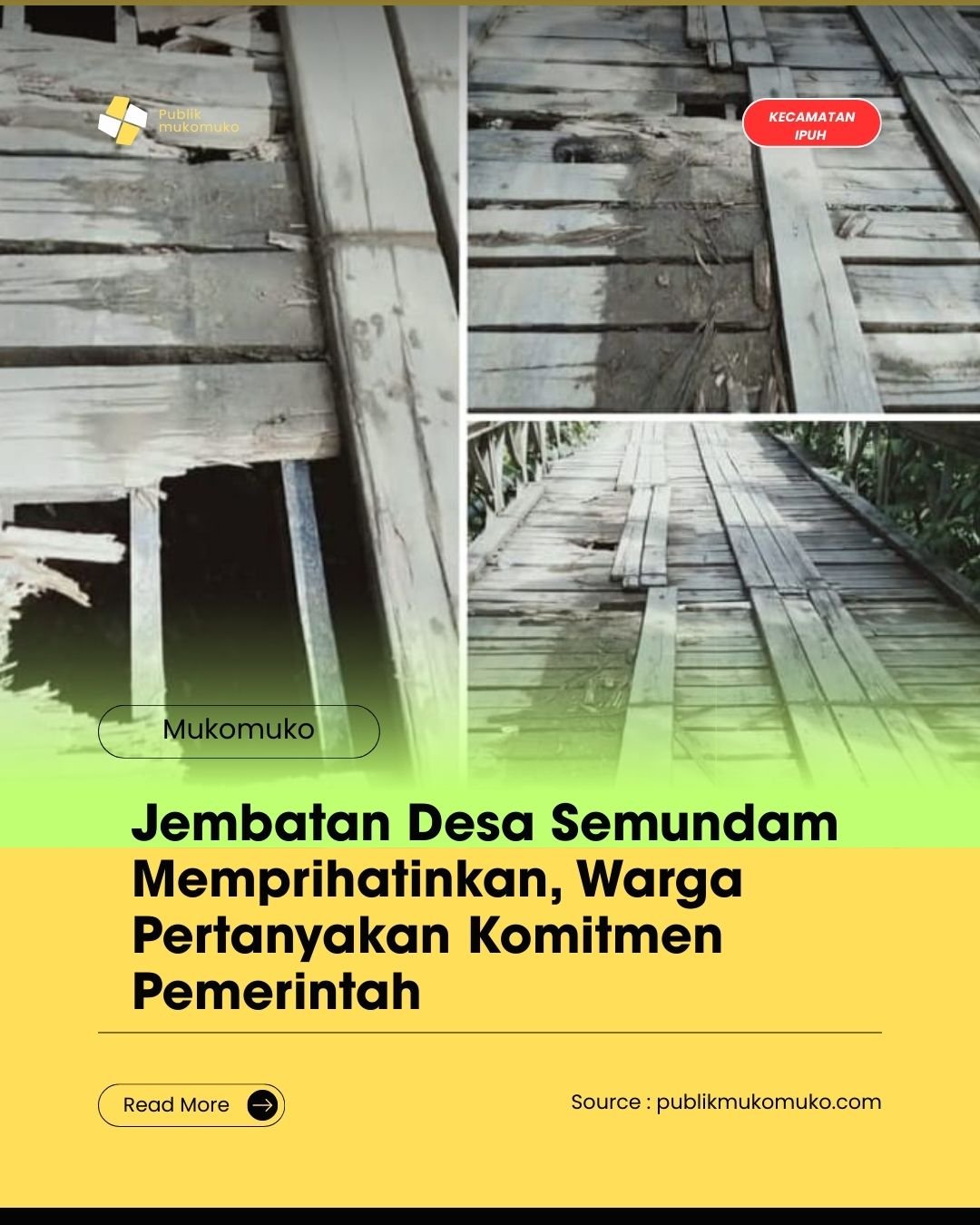 Mukomuko – Kondisi jembatan lintas kecamatan yang berada di Desa Semundam, Kecamatan Ipuh Malin Deman, Kabupaten Mukomuko, kian memprihatinkan. Sejumlah papan jembatan terlihat lapuk, berlubang, bahkan sebagian sudah hancur. Ironisnya, hingga kini belum tampak adanya upaya perbaikan serius dari pihak terkait.