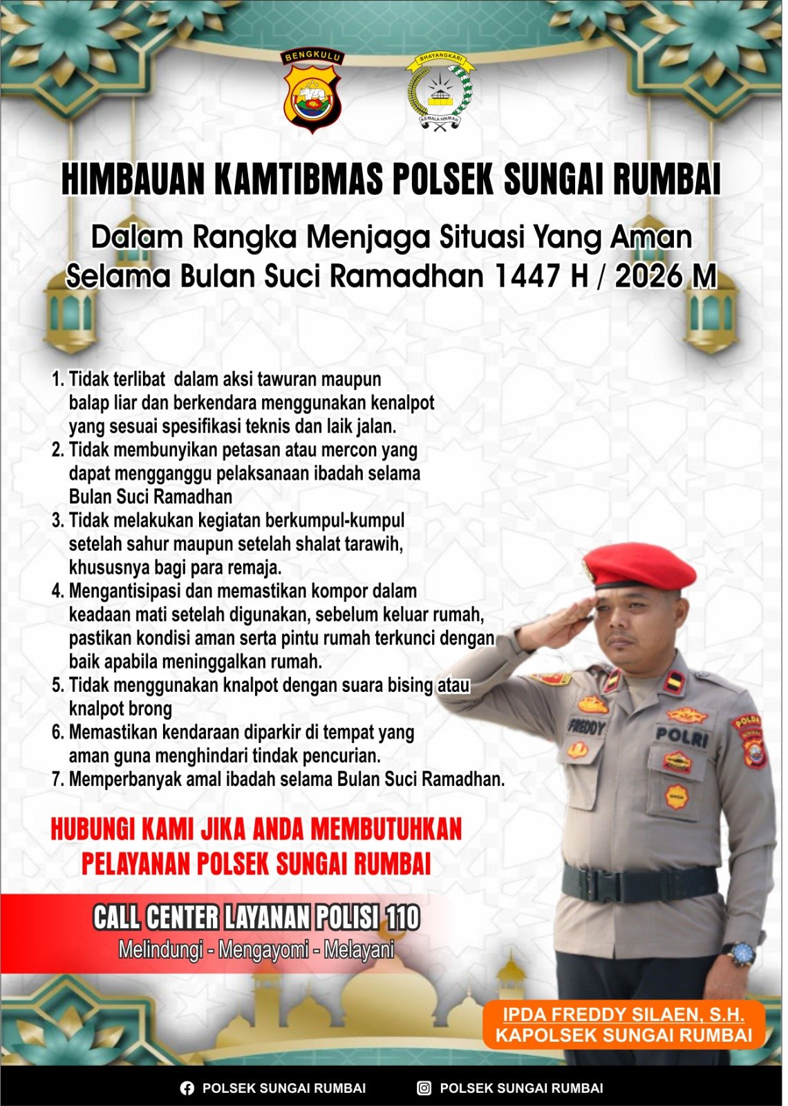 Mukomuko – Dalam rangka menjaga situasi keamanan dan ketertiban masyarakat (kamtibmas) tetap aman dan kondusif selama Bulan Suci Ramadhan 1447 H / 2026 M, Polsek Sungai Rumbai mengeluarkan imbauan resmi kepada seluruh masyarakat Kecamatan Sungai Rumbai.