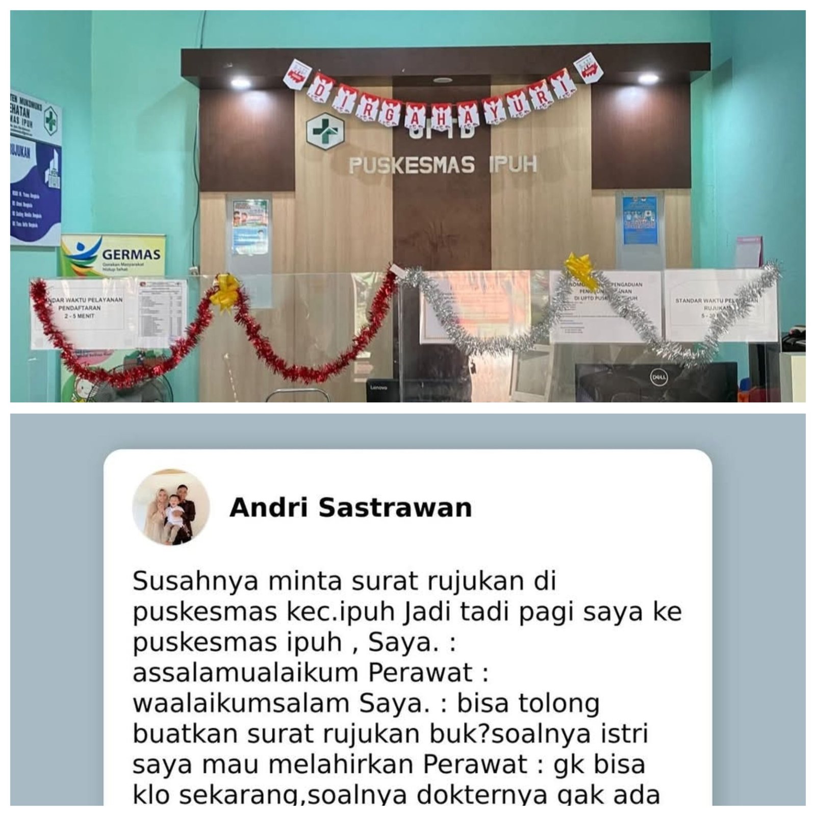 Mukomuko – Setelah unggahan keluhan warga mengenai sulitnya memperoleh surat rujukan di Puskesmas Ipuh viral di media sosial, pihak puskesmas melalui Kepala Tata Usaha (KTU) Pelimpahan cuti dari Kepala Puskemas Ipuh sekaligus pelaksana tugas Kepala Puskesmas Ipuh, Rahmat Naharyanto,memberikan klarifikasi resmi pada Rabu (19/11).