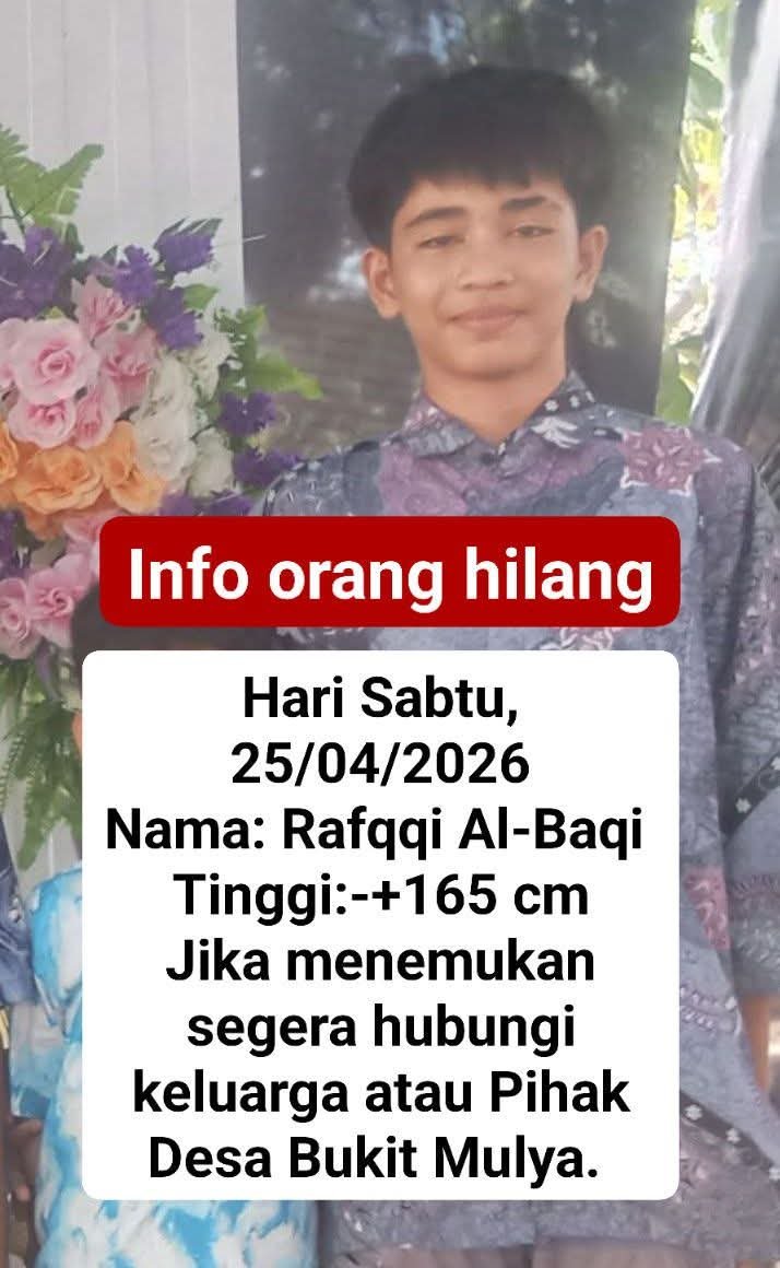 Mukomuko – Seorang remaja laki-laki bernama Rafqqi Al-Baqi (±15 tahun) dilaporkan hilang sejak Sabtu di wilayah Bukit Mulya, Air Rami, Kabupaten Mukomuko. Hingga saat ini, keberadaan korban belum diketahui dan pencarian masih terus dilakukan oleh pihak keluarga bersama warga setempat.